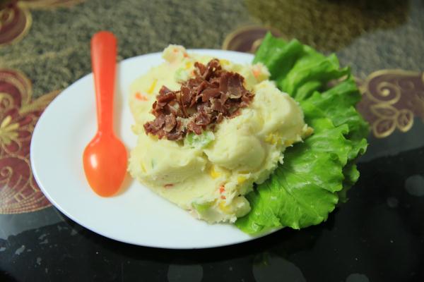 點評:土豆泥很細膩,加入了玉米、黃瓜和胡蘿卜之后,不光色彩搶眼,而且營養(yǎng)豐富。火腿和沙拉醬的組合,更是讓整道菜帶點淡淡的甜和淡淡的咸鮮,又奶香味十足,非常適合老人孩子食用。