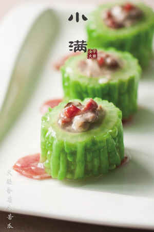 3. 將調好的餡料塞入苦瓜內,擺盤,上火隔水蒸8分鐘起鍋即可。